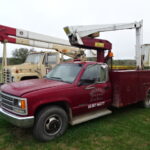 *1990 CHEVY 3500 STAKE TRUCK W/ MAN BUCKET, 122K, AUTO, V-8, READING UTILITY BOX W/ HYD. SINGLE MAN BASKET, WEIGHT FEE 9360#, VIN#255619