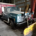 *MOM 1979 GMC 3500 1 TON 4X4 DUALLY STAKE TRUCK, HYD. DUMP BED, MEYER 8’ POWER ANGLE SNOWBLADE, V-8 GAS, 4 SPD, VIN# N/A
