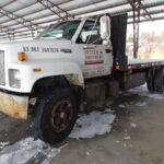 *1994 CHEVY KODIAK 4X2 CAB & CHASSIS S/A STAKE DELIVERY TRUCK, 310K MILES, CAT 3116 DSL. ENGINE, 6 SPEED TRANS. 96”X16’ BED W/ HOIST, 11R22.5 TIRES, HYD.BRAKES, COMES W/ 22’ REAR PIVOT MOUNTED BELY PULLEY DRIVEN SHINGLE ELEVATOR, VIN# 100970
