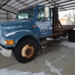 *1996 INTERNATIONAL 4700 SERIES 4X2 S/A STAKE DELIVERY TRUCK, T44E DSL. ENGINE, 150K MILES, 5 SPEED SPICER MANUAL TRANS. HYD. BRAKES, 96”X16’ BED W/ HOIST (HOIST FUNCTIONS, VERY RUSTY PIVOT PINS NEED ATTENTION) LO-PRO 22.5 TIRES, CAB SHOWS RUST, VIN# 316874